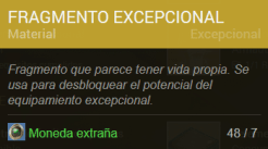 Guerrero Eterno: casco excepcional para la clase Titán por tan solo 13 Monedas Extrañas Huesos de Eao: botas excepcionales para Cazador también por 13 Monedas Extrañas Vestimentas de Colmillos del Vacío: excepcional para Hechicero de nuevo por 13 Monedas ExtrañasLa Última Palabra: cañón de mano excepcional a cambio de 23 Monedas Extrañas Fragmento Excepcional: material para mejorar armas y armaduras excepcionales a cambio de 7 Monedas Extrañas Engrama excepcional de coraza a cambio de 23 Motas de Luz