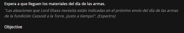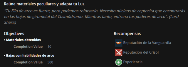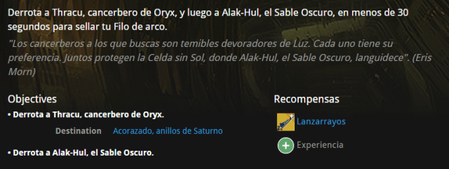 Estos nuevos contratos excepcionales constaran de 6 pasos, en los que deberemos completar diferentes desafíos para obtener el nuevo tipo de arma. Como sabéis tendremos 3 tipos de espada excepcional, cada una correspondiente a un daño elemental (Solar, Arco y Vacío) y cada una cuenta con sus propios movimientos característicos. Hay que decir que los pasos para las 3 espadas exóticas son prácticamente iguales, solo cambian algunas pequeñas cosas, pero os dejare aquí abajo los tres contratos para que los leáis íntegramente por vuestra cuenta.
